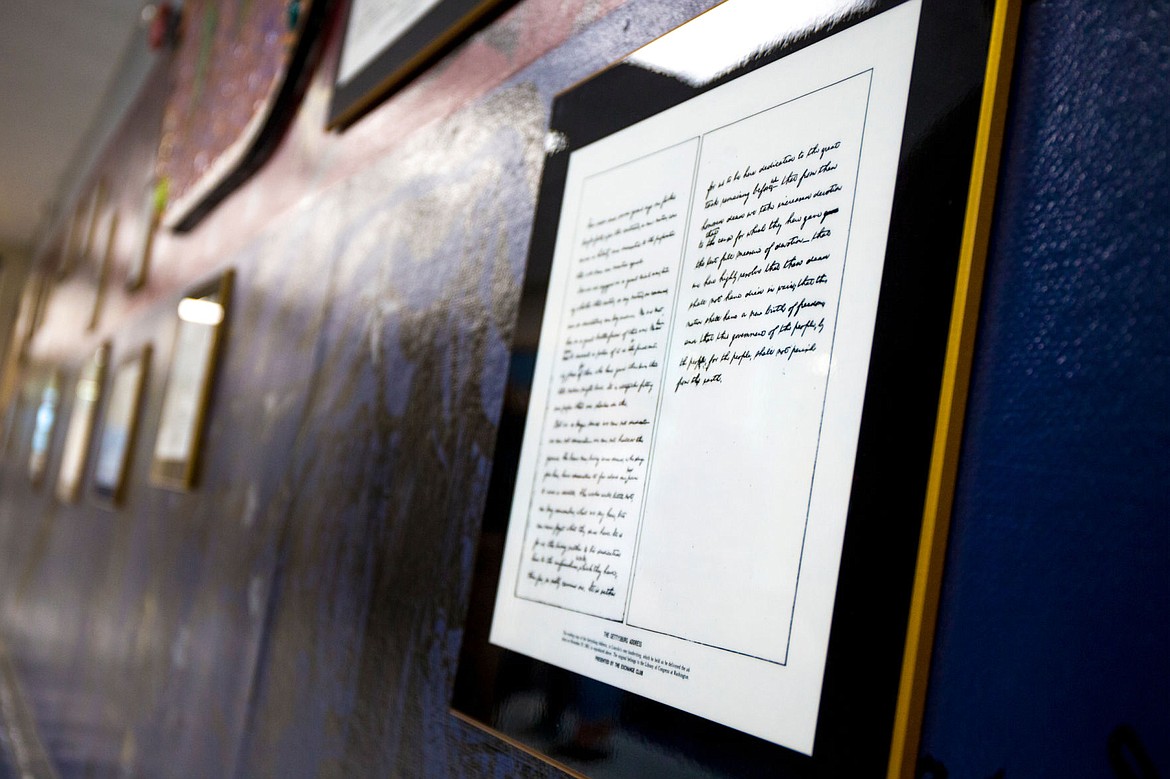 The shrine includes 19 replicas of historical documents, such as the Constitution and the Emancipation Proclamation, that are on plaques and positioned throughout the timeline.