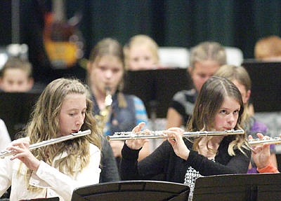 Sixth grade band members Mackenzie Foss, left, and Acacia Foreman perform during Tuesday evening's fall band concert which included bands from the elementary, middle and high school with solos performed by Ember Rode, Janina Daep, Gabby Fantozzi, Chase Benner, Katelyn Reeves, Trey Thompson, Sabra Hancock, Colton Tubb and Chris Williams. (Paul Sievers/TWN)