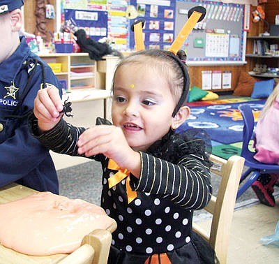 “Butterfly" Alexa of the Libby Public Preschool saving a plastic spider from drowning in orange slime during costume day on Friday. (Bethany Rolfson/TWN)