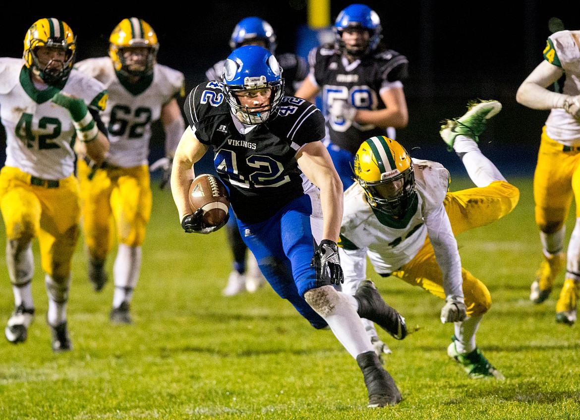 In the second half, interceptions by Ross Chadderdon and Ben Hoffman led to Viking touchdowns. Chadderdon also had a fumble recovery in the first half when Joey Naccarato dislodged the ball from the quarterback and Chadderdon caught it.