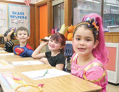 Jared Ewing, Wesley MacDonald and Rosalin Baney of Libby Elementary School dressed in their Halloween attire. (Bethany Rolfson/TWN)