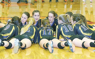 Members of the Libby High varsity volleyball team huddle on the floor prior to Saturday’s District 7B championship. (Caleb M. Soptelean/TWN)