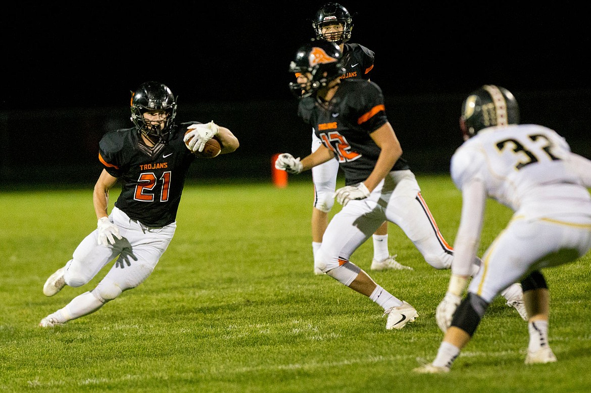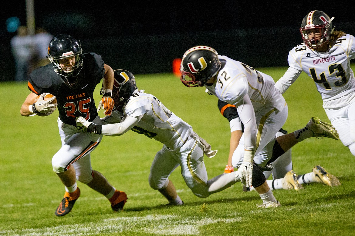 A forced fumble recovered by junior cornerback Junior Williams on the second play from scrimmage. A pair of deep touchdown passes from Nate Buer to Jayden Gering, as well as a blocked punt for a touchdown, led to the Post Falls Trojans rolling to a 49-7 win over the University Titans in the Trojans’ home opener.