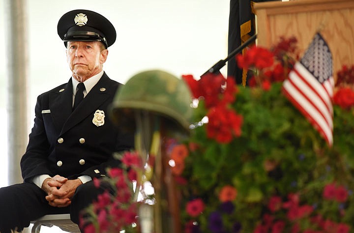 Paramedic/Firefighter Bill Thomas of Thousand Oaks California, listens as speeches are given at the third annual 9/11 Benghazi Memorial Ceremony in Bigfork on Sunday, September 11, at the Flathead Lake Lodge. Thomas is the force behind the creation of the Remember the Four statue which memorializes U.S. Ambassador J. Christopher Stevens and Sean Smith, a U.S. Foreign Service information management officer, as well as CIA contractors and former Navy SEALs, Tyrone S. Woods and Glen Doherty. (Brenda Ahearn/Daily Inter Lake)
