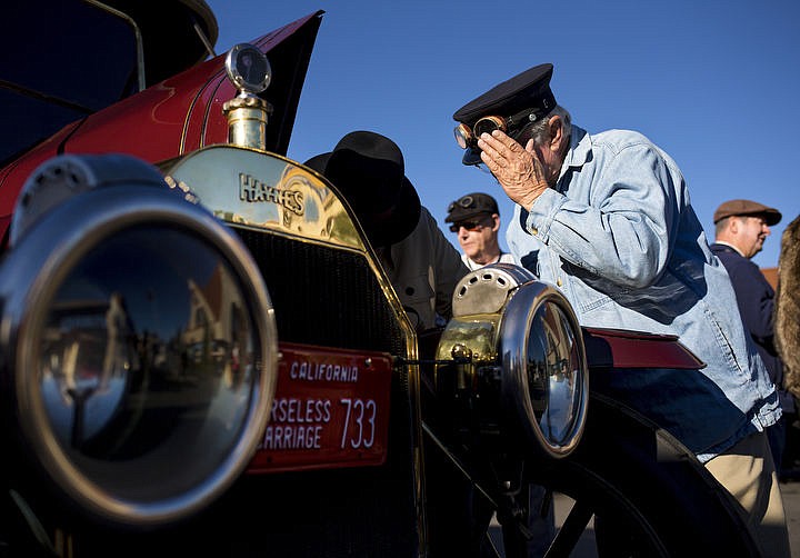 <p>Men work on starting the engine of a Haynes horseless carriage on Tuesday, Sept. 13, 2016 before the start of the second day of the 19th Annual Regional "Pandhandle Scramble" Tour. More than 100 horseless carriage enthusiasts drive their vintage cars that are at least 100-years-old through St. Maries, Hayden Lake, Coeur d'Alene and Bayview in the annual tour. The Skagit-Snohomish Region of the Horseless Carriage Club of America organizes the annual event.</p>