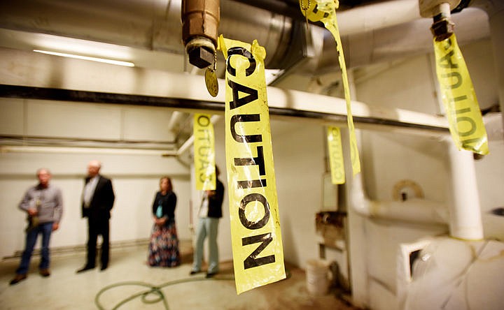 Caution tape marks the pipes in the basement of the Linderman Education Center. (Brenda Ahearn photos/Daily Inter Lake)
