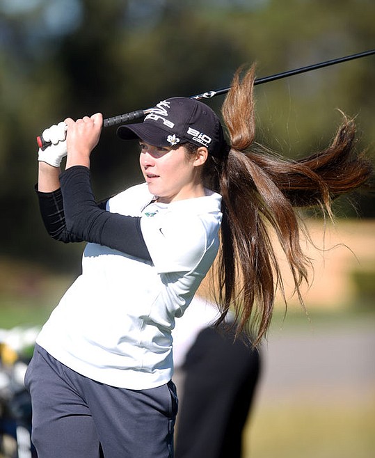 Glacier senior McKenna Tinseth tees off during the Kalispell Invitational Golf Tournament on Wednesday morning, Sept. 14, at Northern Pines Golf Course. (Brenda Ahearn/Daily Inter Lake)
