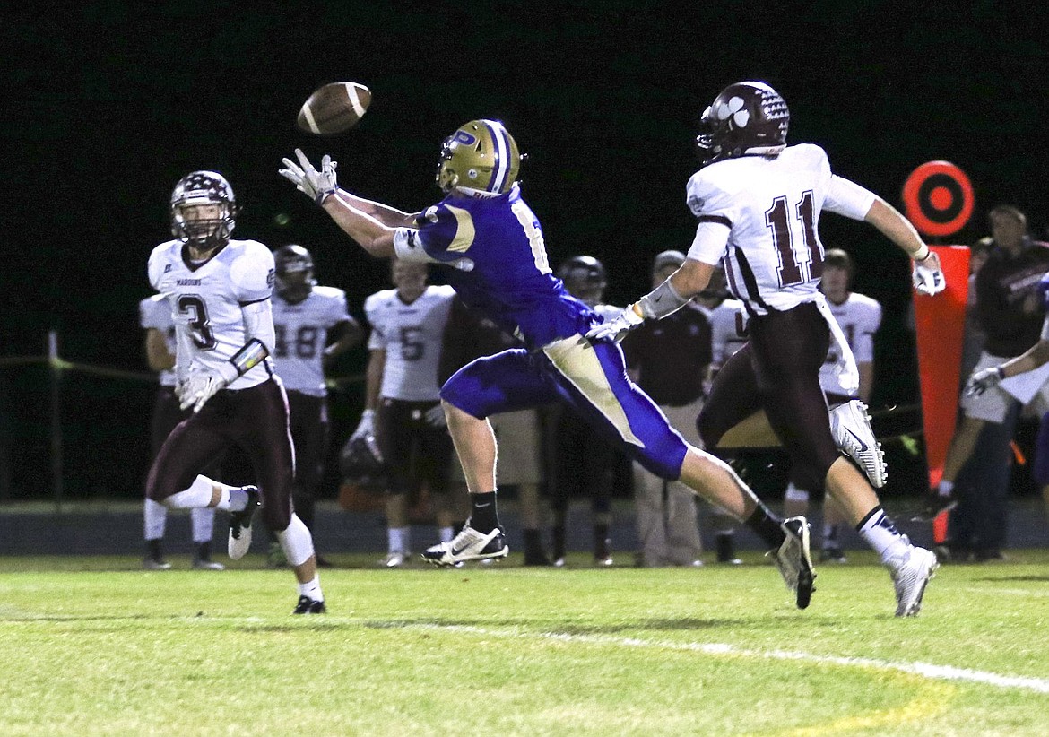 Polson wideout Matthew Rensvold (center) catches a pass from Tanner Wilson in this 2015 file photo. (Kylie Richter/Lake County Leader, file)
