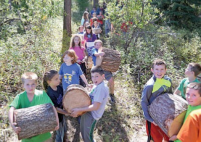 Nearly 300 Libby elementary students last week spent about an hour collecting wood from five Douglas Fir trees cut down to be auctioned off in October. The auction will benefit Kiye Jenkins and Katherine Lind, two students diagnosed this year with stage four Hodgkins Lymphoma. (Seaborn Larson/The Western News)