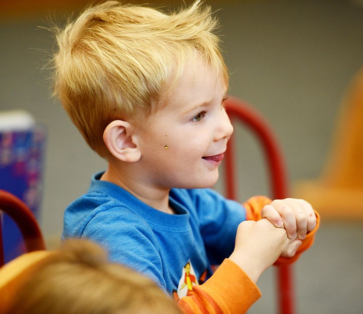 Hudson McDonald, 3, listens enthusiastically at story time at the West Shore Community Library on Friday morning, September 16. (Brenda Ahearn/Daily Inter Lake)