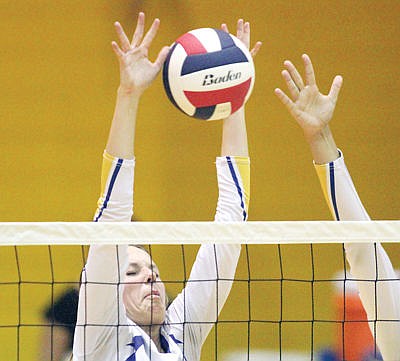 Junior Emily Mossburg with a block in third game vs. Bigfork Thursday, Sept. 15. Lady Loggers in three: 25-15, 25-20, 25-23. (Paul Sievers/The Western News)