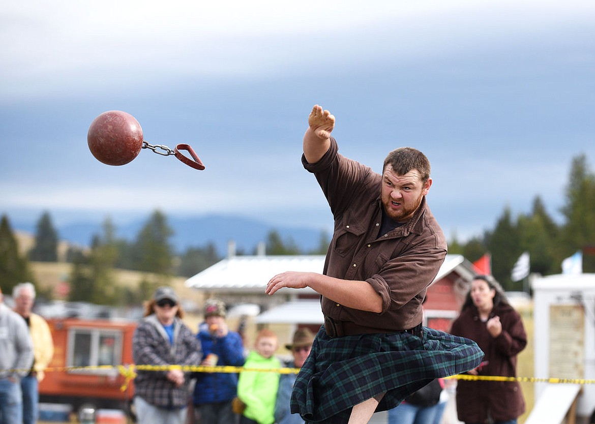 Jon McLaury of Libby throws a 56-pound weight during the weight for distance competition of the Highlands Athletics for the Flathead Celtic Festival at Herron Park on Saturday. Twenty-two athletes participated in nine traditional events. (Aaric Bryan/Daily Inter Lake)