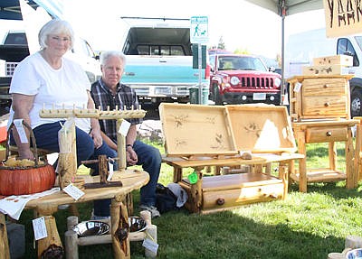 Valerie and Jerry Cornwall-Brady of Yaak Valley Log Works, in their Kootenai Harvest Festival booth. Jerry is the craftsman, and Valerie creates the wood-burning designs. (Bethany Rolfson/The Western News)