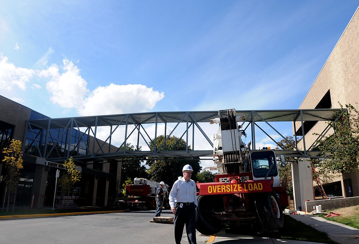 Workers finish the installation of the beams for the skybridge between the Flathead County South Campus Building and Earl Bennett Building on Tuesday. (Aaric Bryan/Daily Inter Lake)