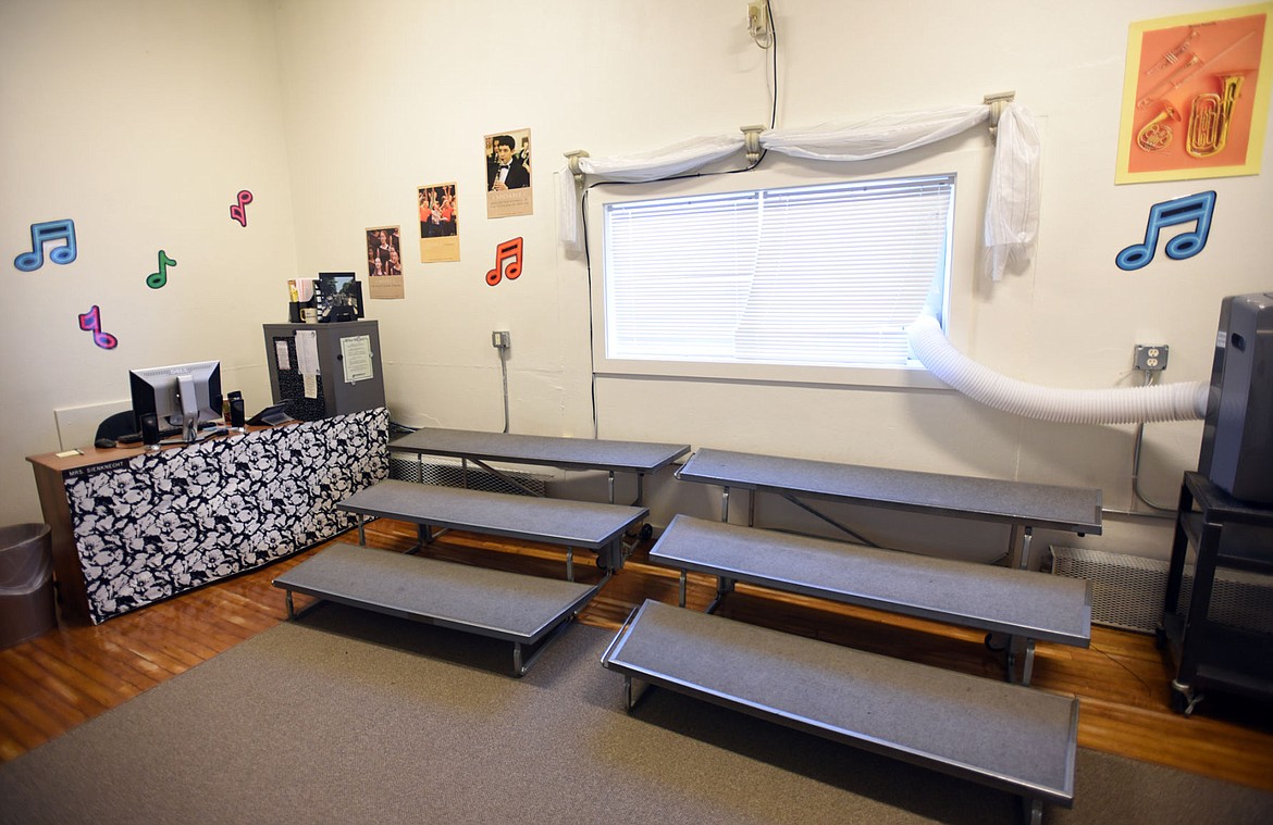 The music room at Elrod has taken over the stage to give students a space for music class, but has eliminated the area for performances. (Brenda Ahearn/Daily Inter Lake)