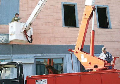 Hotel Libby's Richard Burger, left, removes the plywood covers in preparation for the installation of 36 new windows Sept. 15. With Mike Noble at the controls. (Paul Sievers/The Western News)