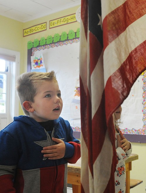 Cashton Fields starts the day by saying the Pledge of Allegiance on Thursday. (Aaric Bryan/Daily Inter Lake)