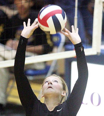 Troy senior Allie Brown setting in third game vs. Libby Sept. 22. Libby in three: 25-10, 25-11, 25-15. (Paul Sievers/The Western News)