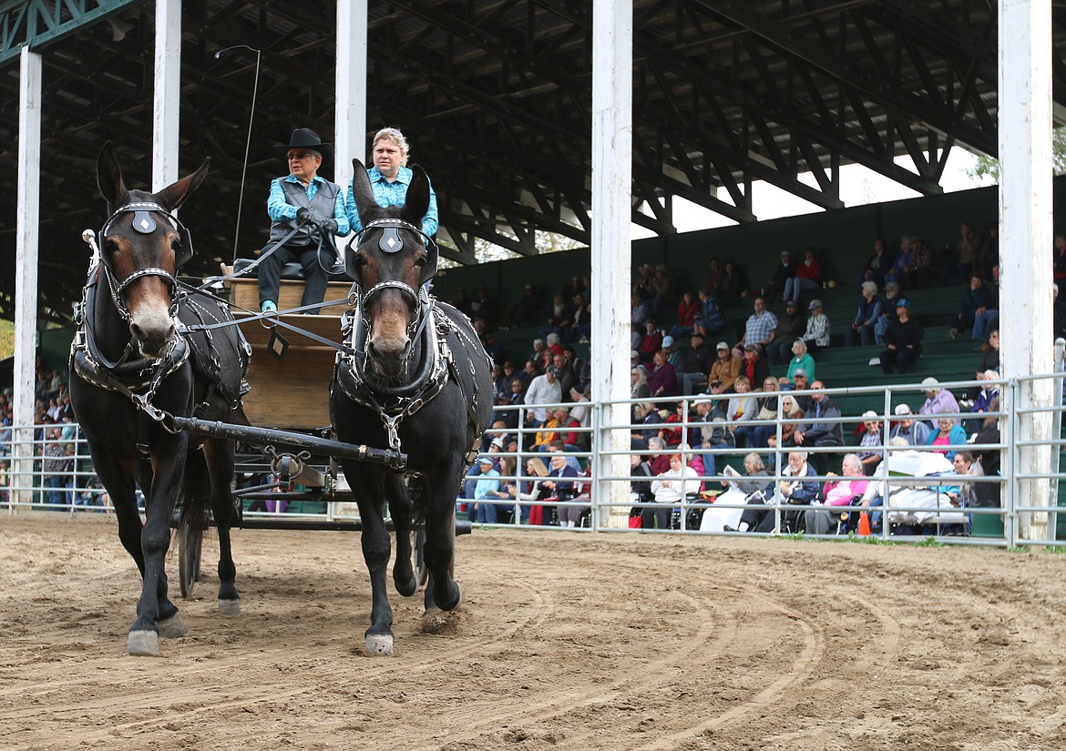 Steffani Lippert, left, of S&D Mules of Ponderay around the course during a driving competition at the Idaho State Draft Horse and Mule International Show on Friday afternoon. Lippert earned first-place honors in the ladies driving competition. The show continues today and Sunday with a variety of shows and events.