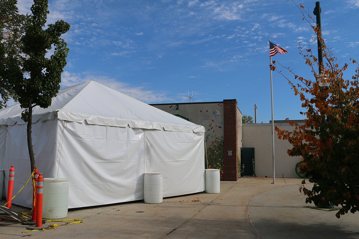 A tent currently covers the new solar panels developed by Solar Roadways, Inc. The panels encompass 150 square feet of the pedestrian path near the fountain and public restrooms at the square. The project is a joint effort by the owners of Solar Roadways, Scott and Julie Brusaw and the city of Sandpoint.