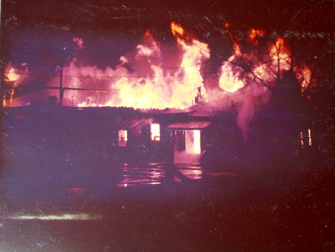“We opened the back door of the club and packed out the parade stuff; helmet liners, rifles, and the flags. We also saved the post charter, the Auxiliary Charter, and the World War I banner. The cash register that was on the bar was also saved. The fire was getting much worse and the fire department stopped us from going back in for anything more. The floor was red hot and I saw it fall into the basement, on top of the bowling alley. By then the fire was out of control.”