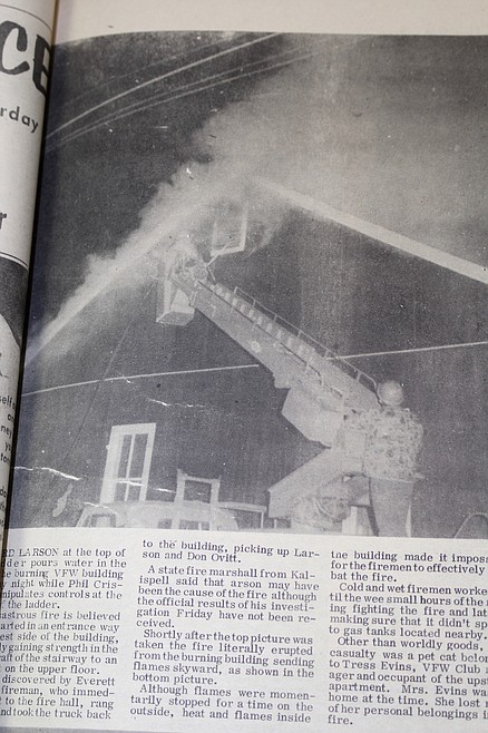 Leonard Larson was at the VFW fire and climbed the ladder seen in the photo to pour water into the building as the fire was raging. He spoke about that night four decades later while looking at original photos and article in “The Plainsman.”