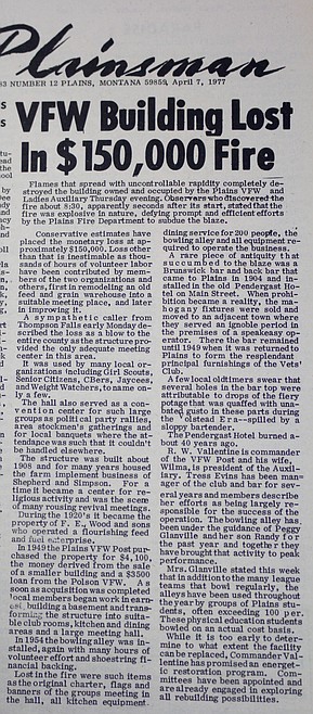 Four decades ago, the fire that burned VFW Post 3596 changed the community of Plains. The fire may have began around 8:30 p.m. on Mar. 31, 1977. The newspaper at that time, “The Plainsman,” covered the fire on the front page. The initial findings from the Kalispell fire marshal indicated that the fire might have been caused by arson. There were two black and white photos, one showing Leonard Larson and Phil Crismore fighting the fire. There were several things lost in the fire. The losses included many of the belongings and one cat belonging to Tress Evins, who was a bartender there and lived in the apartment above the VFW. Fortunately she was not at home when the fire began. There was a long history to the original VFW building that went back to 1949, when the property was purchased for $4,100. The money was raised from the sale of a small building and a $3,500 loan from the Polson VFW. One very large piece of history that was lost had dated back to 1904. It was a Brunswick bar and back bar that was once part of the old Pendergast Hotel in Plains, which was located on Main Street. The mahogany fixtures once were in another town during the years of Prohibition in the 1930s. Once Prohibition was repealed, the bar and back bar were returned to the VFW. There was a six-lane bowling alley in the basement, where many went during the cold winter months. The fire changed the meeting locations for many groups and organizations; the Girl Scouts, Senior Citizens, CBers, Jaycees, and Weight Watchers.