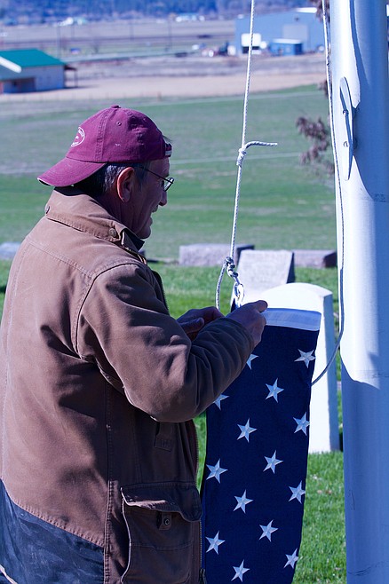 There are six new flags flying high at the Plains cemetery. The last two years, five of the the flags were being purchased by the Plains VFW Post 3596. At 11:00 a.m. Tuesday, April 4, the Plains cemetery sexton Ken Jones raised the American flag, an MIA flag and five military flags; Army, Marine Corps, Air Force, Navy, and Coast Guard. Four employees of the Gambles store in Plains made this possible through their generosity and in memory of family members who have served in the United States military. Denise Newman, John Lemro, Brittany Cook, and Margaret McNeil bought the flags that are now flying at the Plains cemetery. They contacted Joe Eisenbrandt, who knows where the American made flags can be purchased and ordered them. A local family has decided to buy the American flag for the cemetery for the next several generations of the family. This is the first time that there has been a MIA flag flying at the cemetery. McNeil spoke about the purchase of the six flags by herself and the other employees.