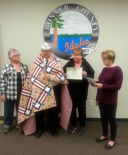 Bill Stevens, master sergeant in the U.S. Marine Corps, was recently presented a Quilt of Valor by quilters Carolyn Inge, Jeannie McMunn and Kary Miller of Sandpoint. Quilts of Valor are awarded to individuals who have served in the U.S. military and have been touched by war. Stevens served during the Vietnam War era and continues to serve his nation in various capacities to this day. Quilters consider their quilts as one of the highest civilian awards they can bestow upon a service member or veteran. The Quilt of Valor Foundation is a non-profit gr…