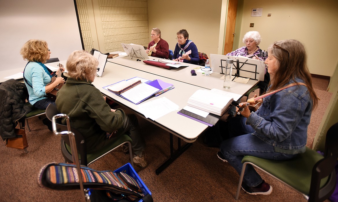 Down two flights of stairs, through a pair of heavy doors and down a musty hallway in Kalispell’s ImagineIF Library, a couple handfuls of women are strumming their ukuleles in between fits of laughter at their twice monthly gathering here in the basement. They’re here for lots of reasons — friendship, music, “forestalling Alzheimer’s” — and brought together by the four-string tool in each of their hands.