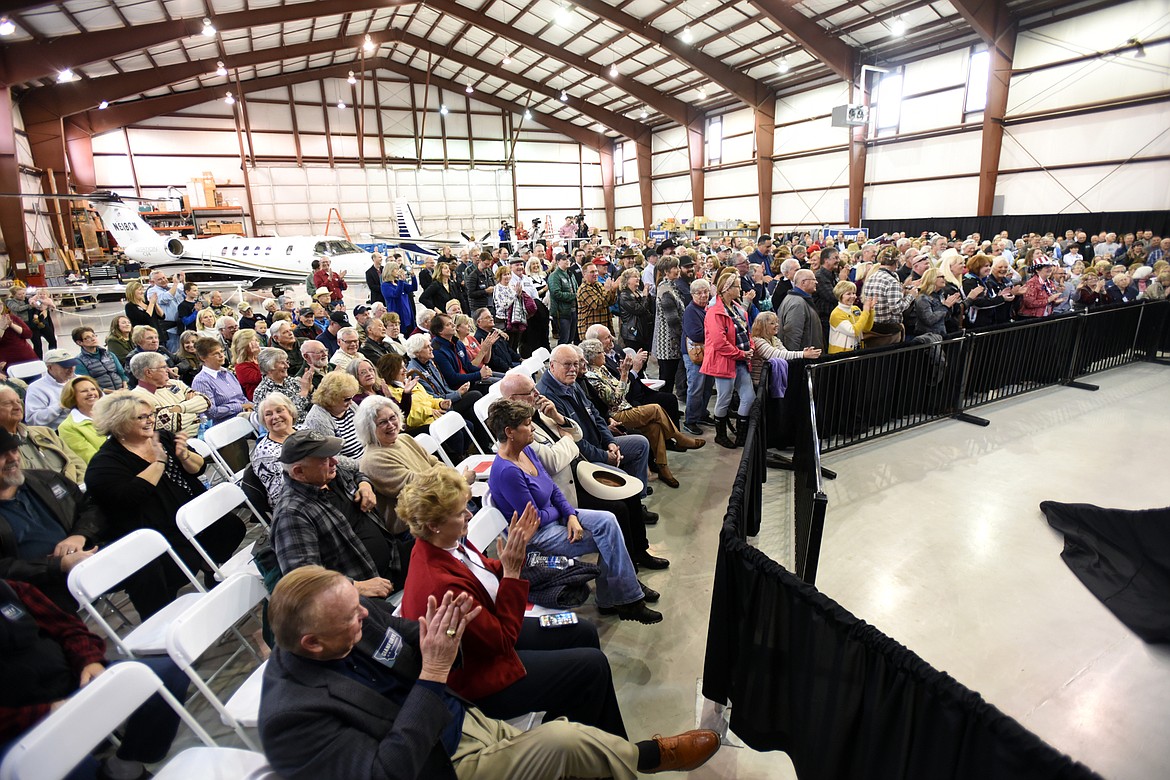 Attendees at a campaign event for Greg Gianforte cheer as Donald Trump Jr., addresses the crowd on Friday, April 21, at the Eagle Air hangar at Glacier Park International Airport north of Kalispell.