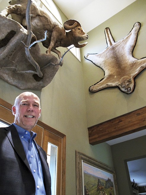 FILE - In this Oct. 5, 2016 file photo, gubernatorial candidate, Republican Greg Gianforte poses below animal trophies in his home in Bozeman, Mont. Donald Trump Jr. will be targeting more than Republican voters when the president's son campaigns for U.S. House candidate Greg Gianforte in Montana on Friday, April 21, 2017 and Saturday, leading to backlash from at least one animal-rights organization. Gianforte, who is up against Democrat Rob Quist in the May 25 election for the U.S. House seat vacated by Interior Secretary Ryan Zinke, is planning to take Trump on a prairie dog hunt during their four-city campaign tour. (AP Photo/Matt Volz, File)