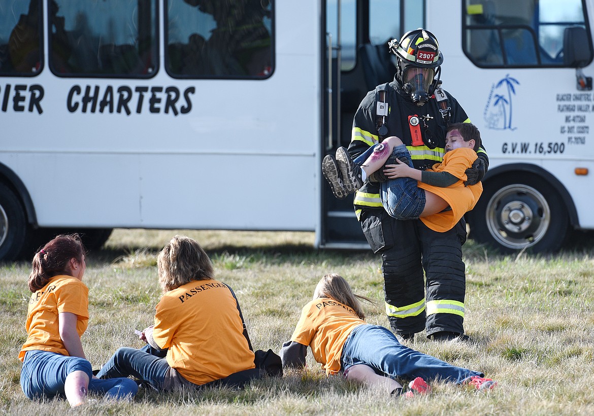 On Saturday, 48 volunteers acted out the part of the injured victims in the simulated crash. The volunteers, wearing yellow shirts labeling them as passengers, were spread throughout the impact zone. A small Glacier Charters bus served as the plane’s fuselage, and while some of the passengers were still inside, most of the victims were outside.