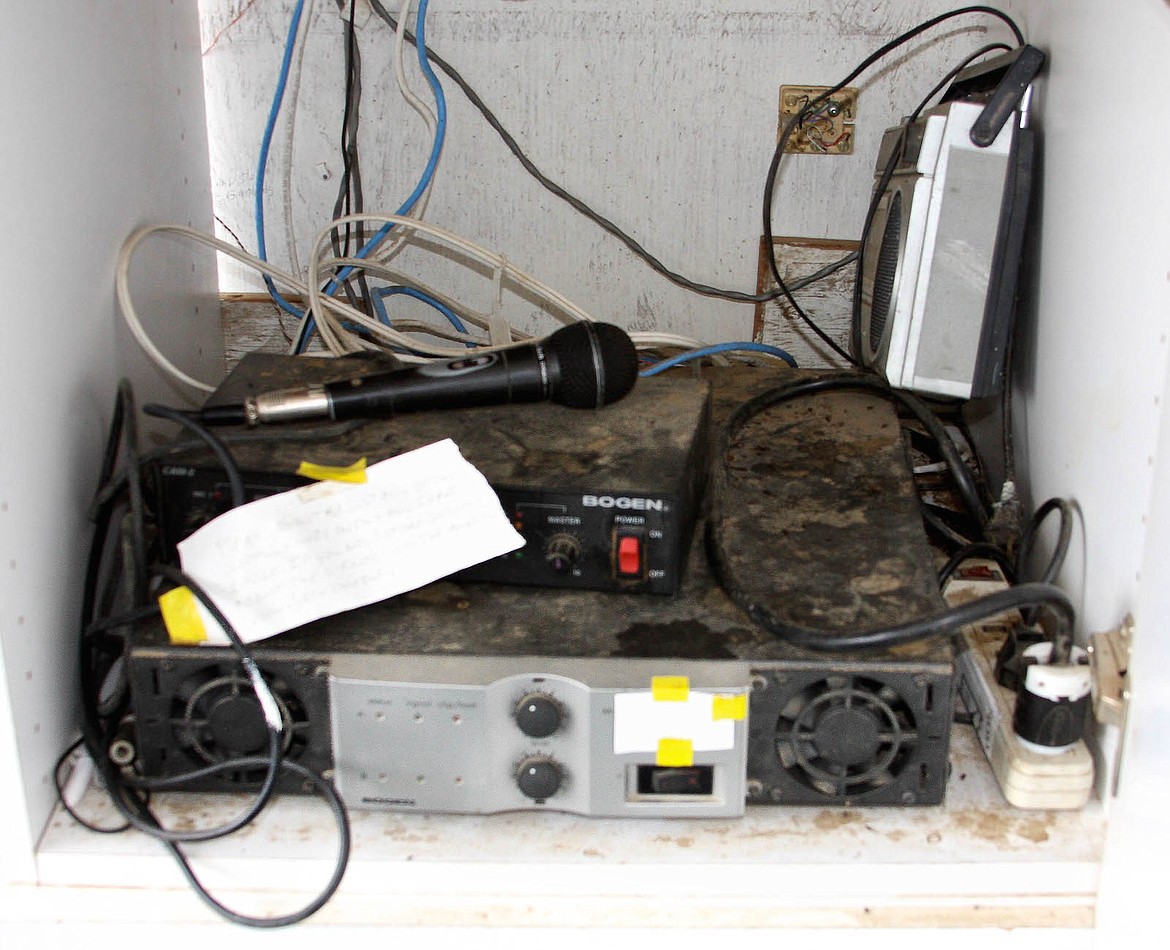 If you were expecting a state-of-the-art public address system, you’d best dial those expectations back close to 50 years, because the gear inside is of that vintage. A simple, not too powerful amplifier, an added on mixer and microphone and a small boom box, on duty to provide incidental music as needed.