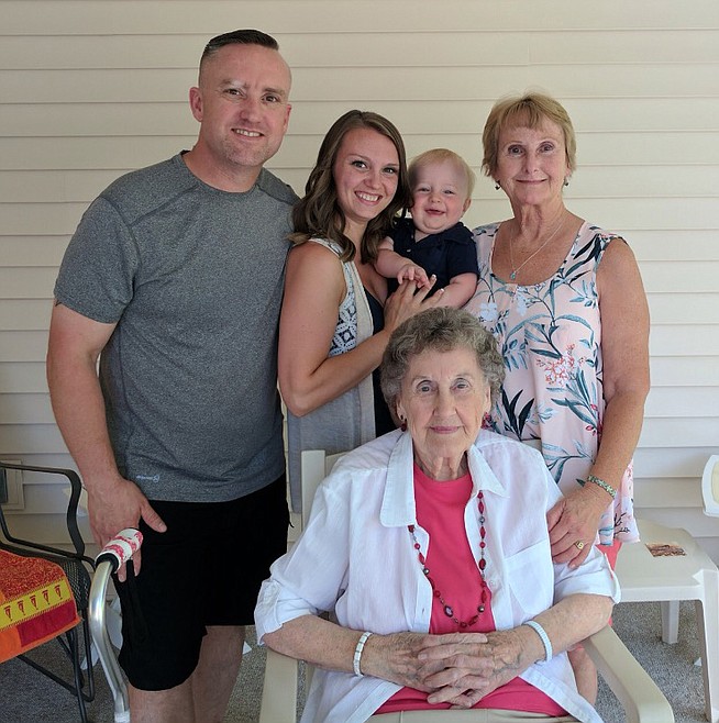 We are thankfully celebrating five generations. From left to right, Rob Sherar, Ashley Zierer, Grayson Lee Zierer, Marilyn Masterson and seated is great-great-grandmother Ethel Freligh.