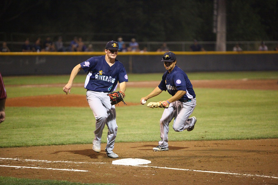 The River Dogs put the pressure on the Marauders right away in the bottom half of the eighth pinch hitter Ethan Etter singled to lead off the inning, hitting out of the nine hole to get back to the to top of the order. Dakota Fingar, who had the big home run Monday, caught the Mount Olive defense by surprise with a perfectly placed bunt, again, keeping the pressure on the team from New Jersey.