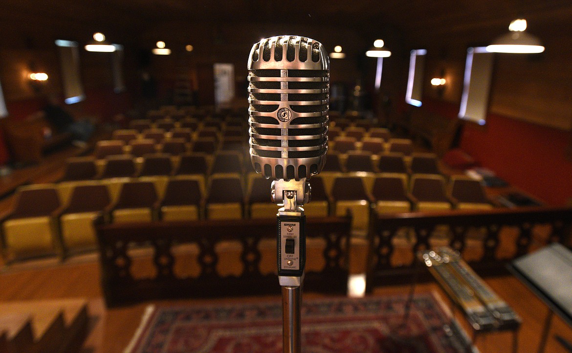 A replica of a microphone that was used in the time of Elvis stands on the stage of the LaSalle Grange Theatre. (Aaric Bryan Daily Inter Lake)