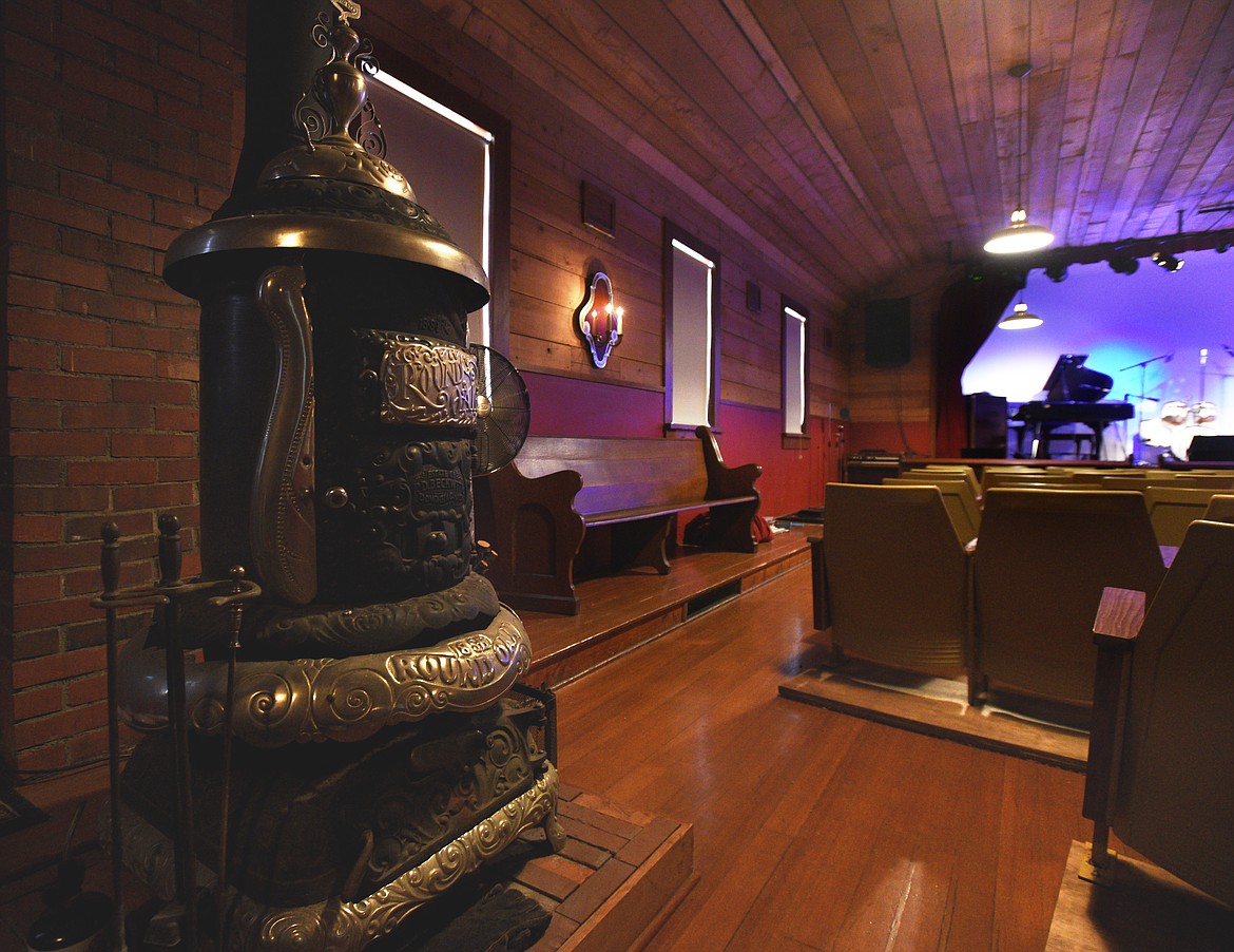 A stove from 1912 sits in the corner at the LaSalle Grange Theatre. (Aaric Bryan/Daily Inter Lake)