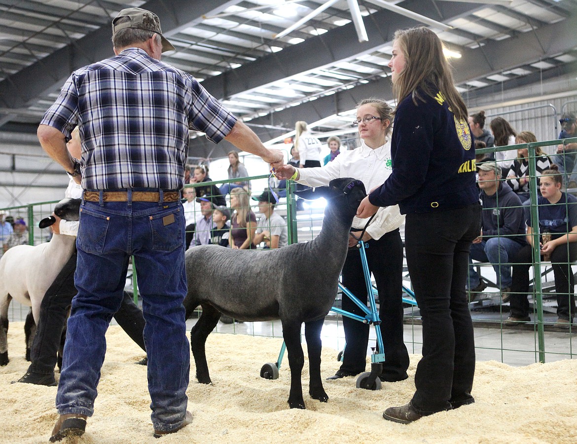 Jenessa Levanen, center, accepts a blue ribbon during a market lamb class at the Northwest Montana Fair on Tuesday. Levanen is permitted to halter her lamb and utilize the help of fellow ag competitor, Krystal Sutton, due to a genetic condition that causes her bones to be extremely fragile.