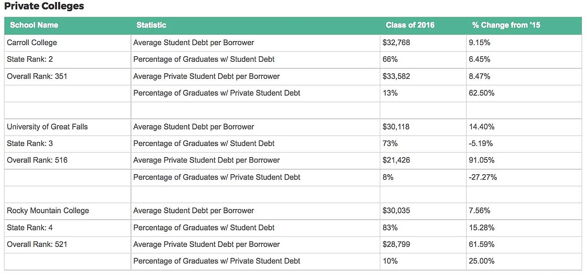 Montana’s private colleges had high average debt per borrower as well, over $30,000 at Carroll College, the University of Great Falls, and Rocky Mountain College. At least 66 percent of grads are in debt at each private school.