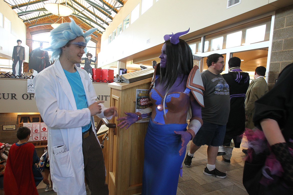 Sean Spencer, 18, of Post Falls, dressed as Rick from the cartoon sitcom "Rick and Morty," right down to the white lab coat and wild blue hair. His friend, Sydney Morgan, 17, also of Post Falls, painted her skin purple to attend as a "World of Warcraft" character called a "draenei."