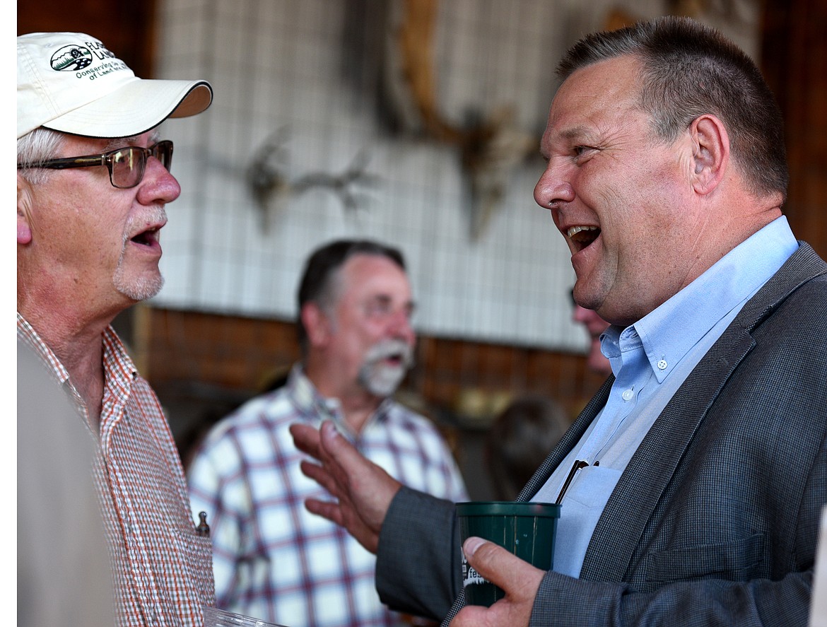 U.S. Senator Jon Tester speaks with Bill Dakin during the Last Best Outdoor Fest on Tuesday. (Aaric Bryan/Daily Inter Lake)