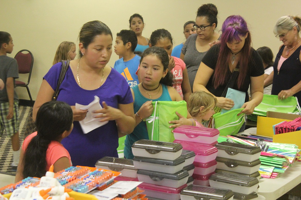 Kayla was one of hundreds of kids who made their way to the Elks Lodge in Moses Lake Tuesday night for a school supply giveaway and free taco dinner. The event was billed to start at 5:30 p.m., but by 5 p.m. the line outside the lodge stretched all the way into the parking lot. The giveaway was made possible by a $4,000 grant the Elks Lodge obtained to be used in the community.