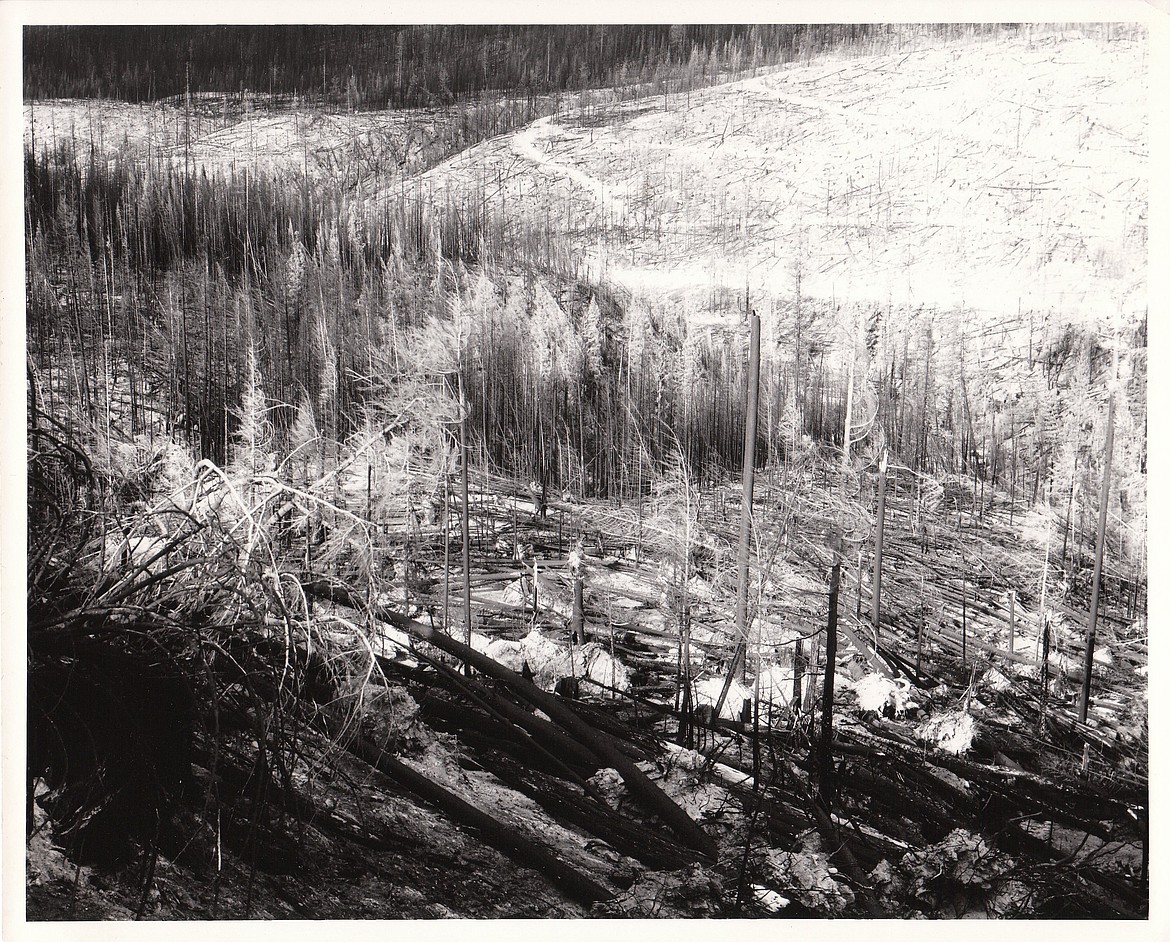 A young man named Randy Langston, the lookout on Roman Nose, narrowly escaped with his life as the fire crested the mountain, burning its path toward his lookout. For whatever reason, the lookout was not destroyed by the fire!