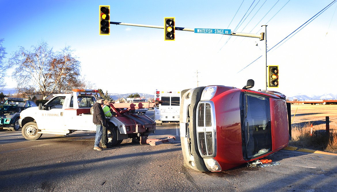 According to Montana Highway Patrol Trooper Jim Hawkins, a westbound Subaru reportedly ran a red light at the intersection of Reserve Drive and Whitefish Stage Road and T-boned a Dodge pickup attempting to make a left turn into the northbound lane. The impact caused the full-size pickup to roll onto its side.