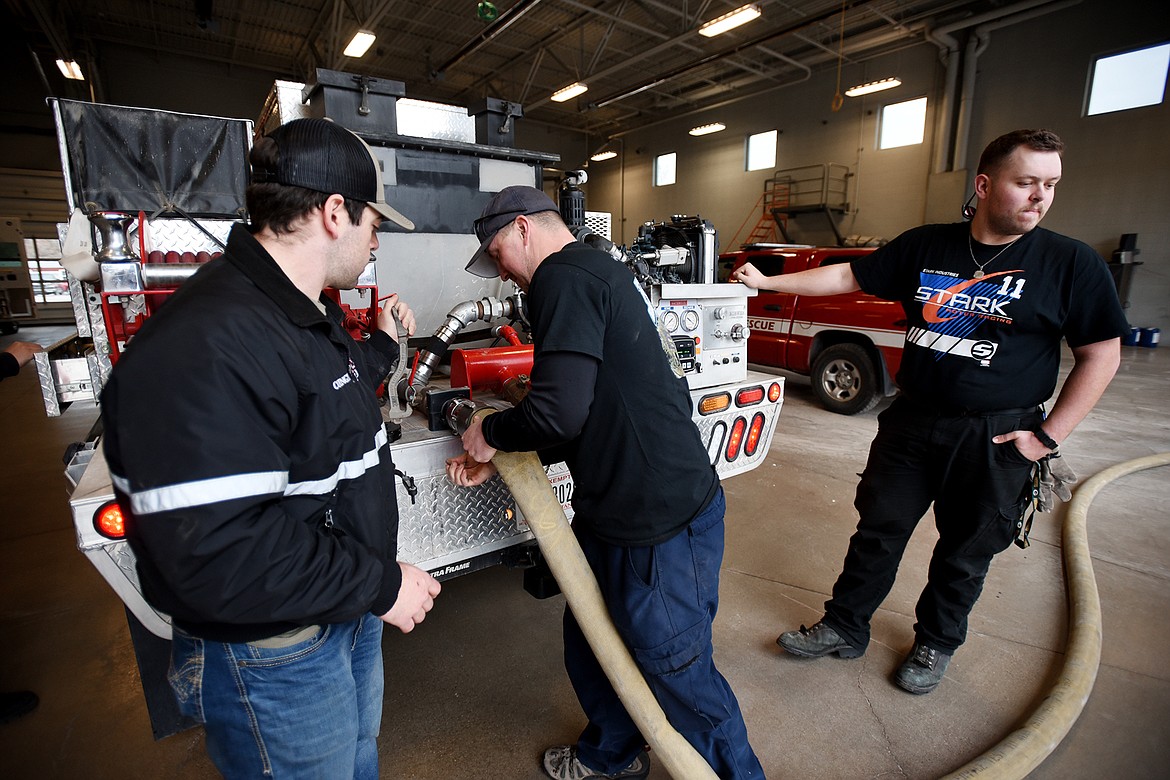 Jack Knuffke, Jared Pitcher and Jackson Corne checked hoses and engines at Evergreen Fire and Rescue on Wednesday as they prepared to head out to fight the fires ravaging Southern California.