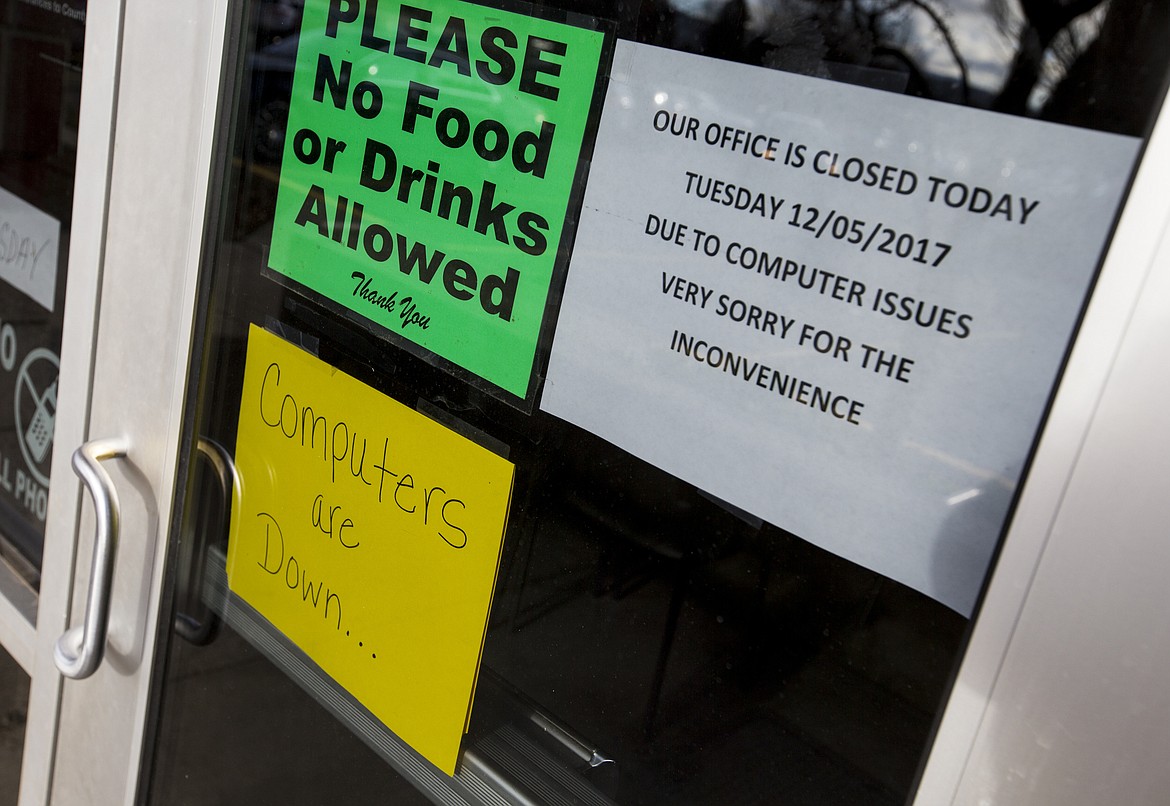 Vincent Trimboli, ITD spokesman, said the Coeur d'Alene and Post Falls DMV offices closed around 8 a.m. shortly after they opened on Tuesday. By mid-morning, the offices were dark and signs notifying patrons of the situation were posted on the doors.