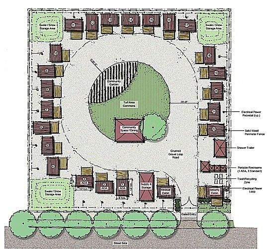 Mickelson said the project would have 10 insulated cabins with electricity to start; security and medical cabins; a gated entry; a community center for dining, showers and portable restrooms; a kennel area for dogs; and a community garden.