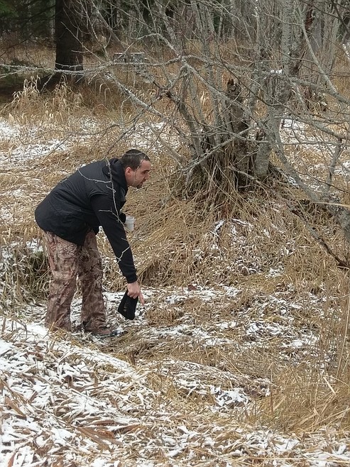 He checked out a couple areas that looked like they could be where someone would seek shelter such as large old slash pile and an area with collapsed logs.