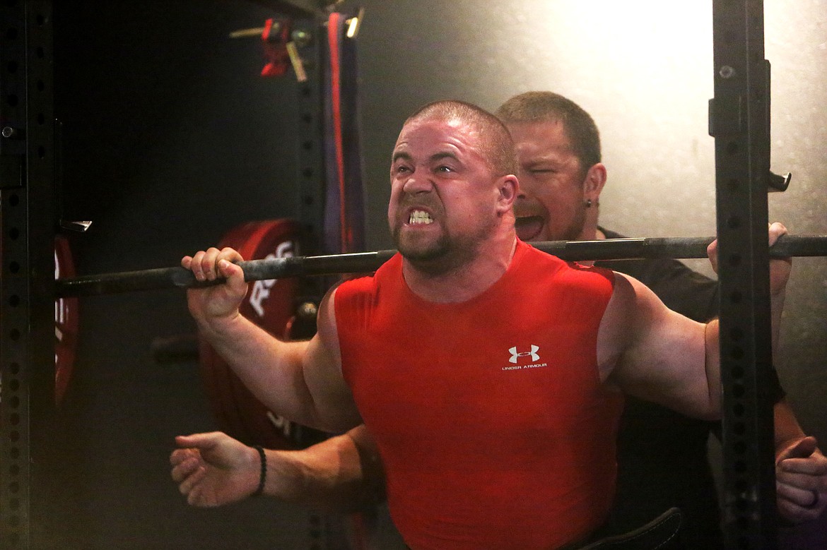 Applegate lifts the loaded bar and sinks into a deep squat, his face contorting with effort. Behind him is gym owner Donny Tudahl, ready to grab the weight in case the load proves too heavy for Applegate. But to a raucous chorus, he straightens his legs, bringing the weight up with him to complete the rep.